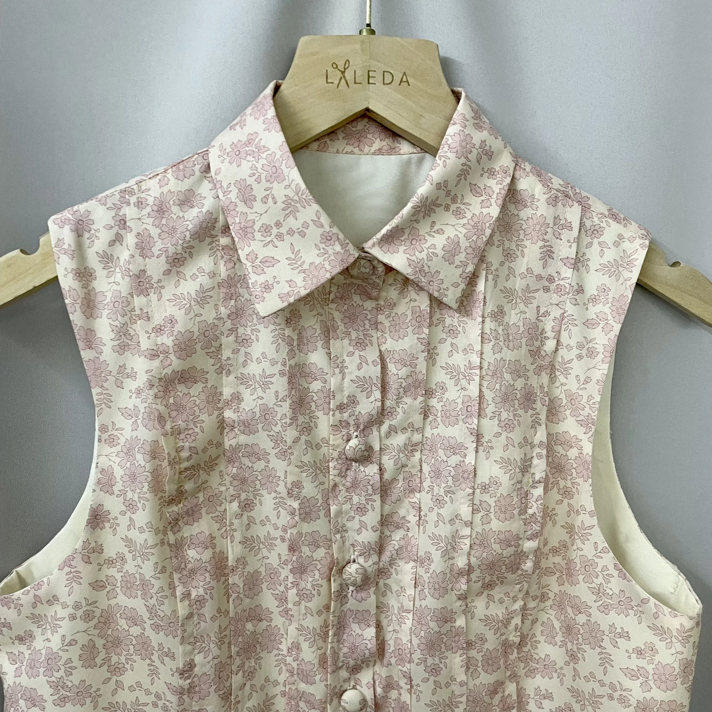 Pink floral sleeveless blouse with vintage print