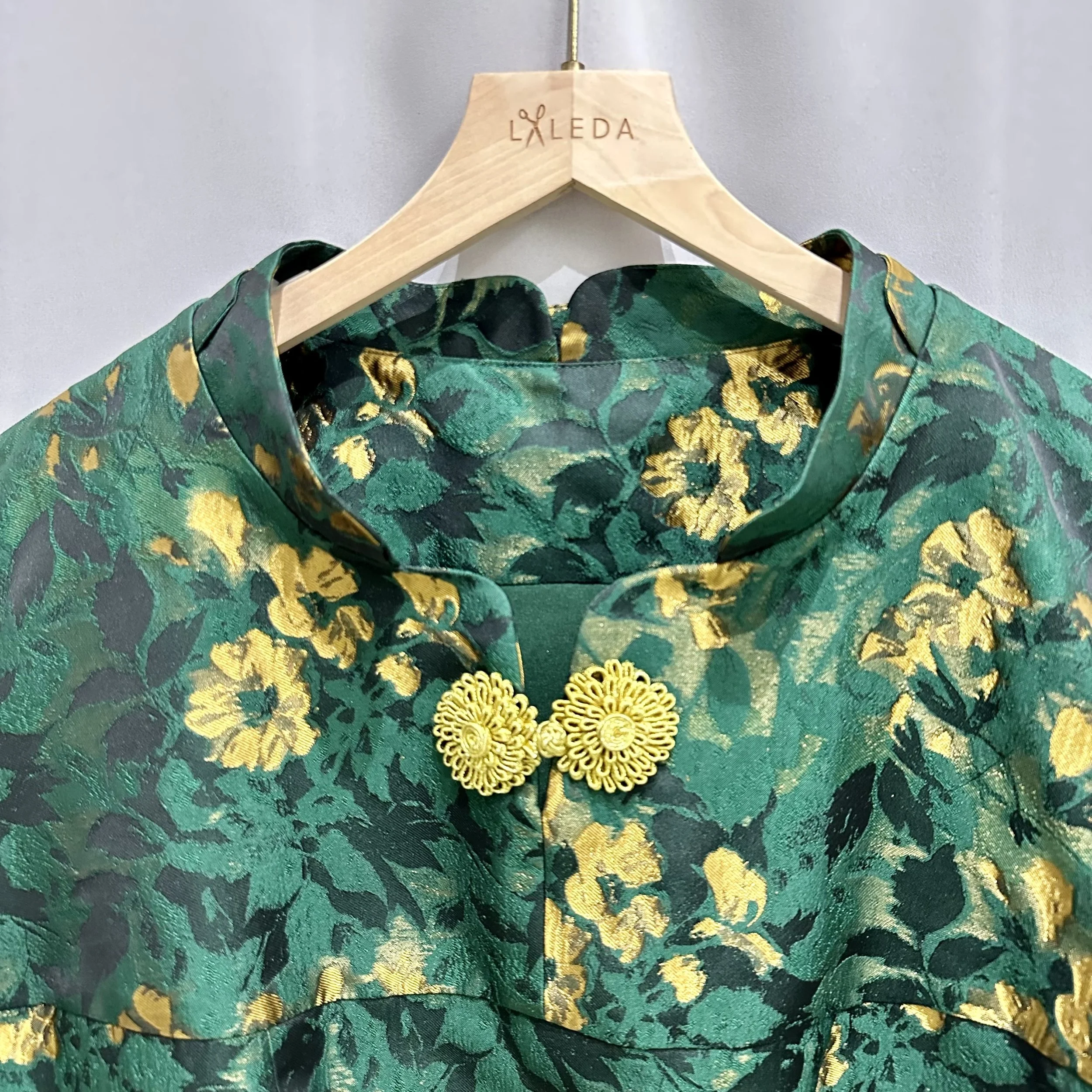 Green dress with delicate floral embroidery on hanger